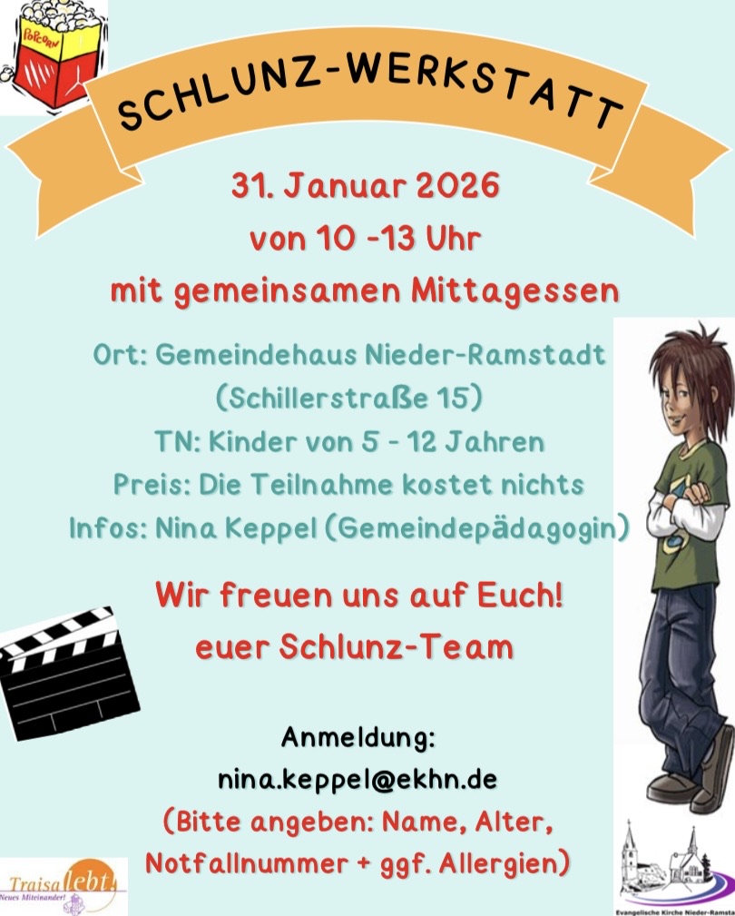 HERZLICHE EINLADUNG Zur nächsten Schlunz-Werkstatt Termin: SAMSTAG, 31.01.2026, 10 – 13 Uhr mit gemeinsamen Mittagessen Ort: Im Gemeindehaus Nieder–Ramstadt (Schillerstraße 15) Teilnehmende: Kinder von 5 bis 12 Jahren Inhalt: Es dreht sich alles um den 9. Schlunz-Film: …