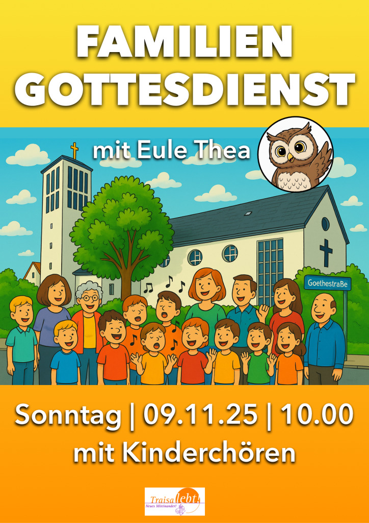 Wir feiern einen Familiengottesdienst mit viel Musik am 09.11.25 um 10.00 Uhr. Zu Gast sind unsere Kinderchöre unter der Leitung von Eva Büschelberger. Als besonderer Gast hat sich Eule Thea angemeldet, die viele Kdiner aus der „KinderKirche“ bereits kennen.