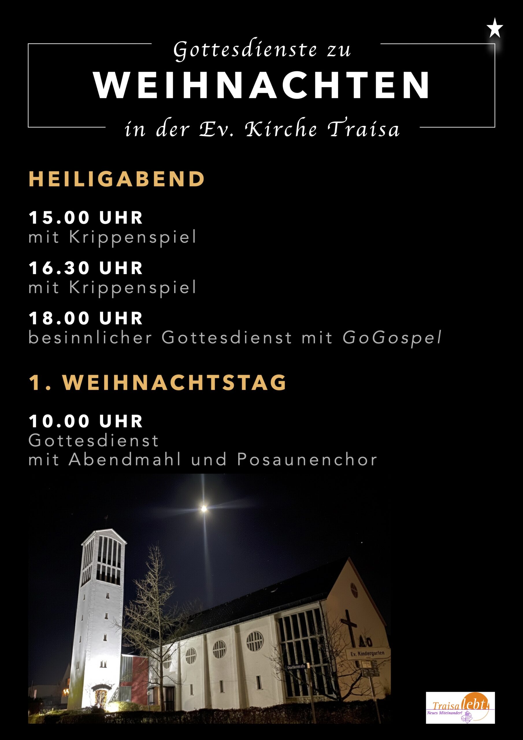 Wir laden herzlich ein zu den Gottesdiensten rund um Weihnachten. An Heiligabend gibt es das Krippenspiel mit den Kinderchören zu sehen und zwar um 15.00 Uhr UND um 16.30 Uhr. An Heiligabend gibt es zudem um 18 Uhr einen besinnlichen …